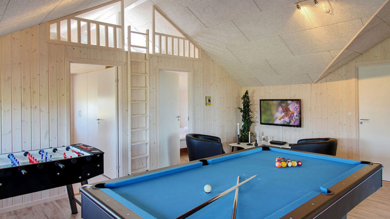 Das Feriendomizil besticht durch einen herrlichen Poolbereich, in dem sich ein 15m2 großen Innenpool befindet, der mit Wasserrutsche und Gegenstromanlage ausgestattet ist und viel Vergnügen im erfrischenden Nass verspricht. Wer die Seele lieber entspannt baumeln lassen möchte, der findet seinen Platz in dem einladenden Whirpool und in der Sauna kann ausgiebig geschwitzt werden. Das Objekt kann sich zu Recht Aktivitätshaus nennen, denn ein großzügiger Bereich ist voll und ganz den sportlichen Aktivitäten gewidment. Dies bedeutet nun nicht, dass ein Trimm-Dich-Rad oder eine Hantelbank auf den Urlauber wartet, dafür können sich die Gäste im Billard, Tischtennis, Tischfußball, Dart und an der Spielekonsole auf vergnügliche Art und Weise duellieren.
