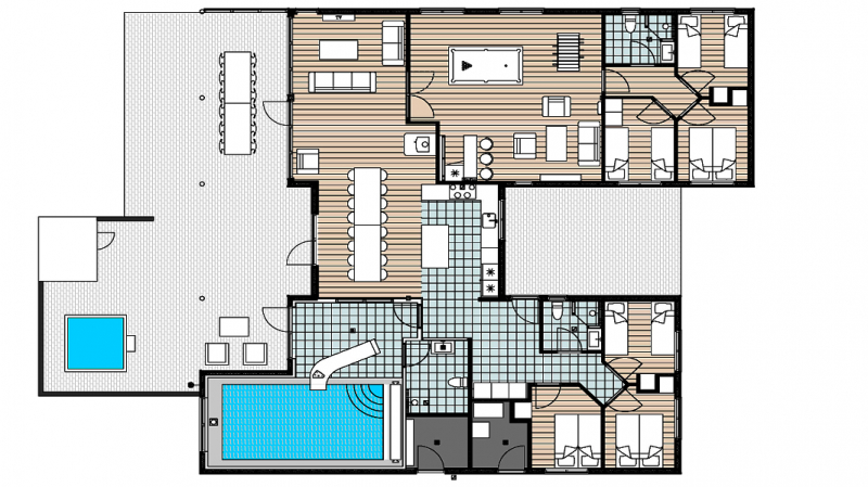 Im Inneren des Gruppenferienhauses werden die Urlaubsgäste von einer ansprechenden Atmosphäre in Empfang genommen, die vor allem durch den Einsatz einer wertigen Einrichtung in Kombination mit einer umfassenden Ausstattung sowie geschmackvollen Gestaltungselementen erzeugt wird. Als das Highlight schlechthin präsentiert sich aber mit Sicherheit der hauseigene Poolbereich, der mit 16m2 großem Swimmingpool samt Unterwasserbeleuchtung, Wasserrutsche, Gegenstromanlage und römischer Treppe zum ausgelassenen Planschen zu jeder Jahreszeit einlädt. Wem der Sinn eher nach ein wenig mehr Action steht, der stattet dem Aktivitätsraum hingegen einen Besuch ab, denn hier laden Billard, Tischtennis, Darts, Tischfußball und Spielekonsole zu zahlreichen freundschaftlichen Duellen ein und an der Bar lässt sich zwischendurch oder im Anschluss ein kühles Getränk genießen.