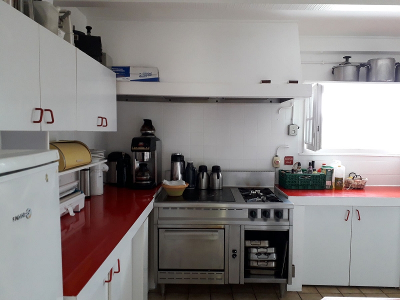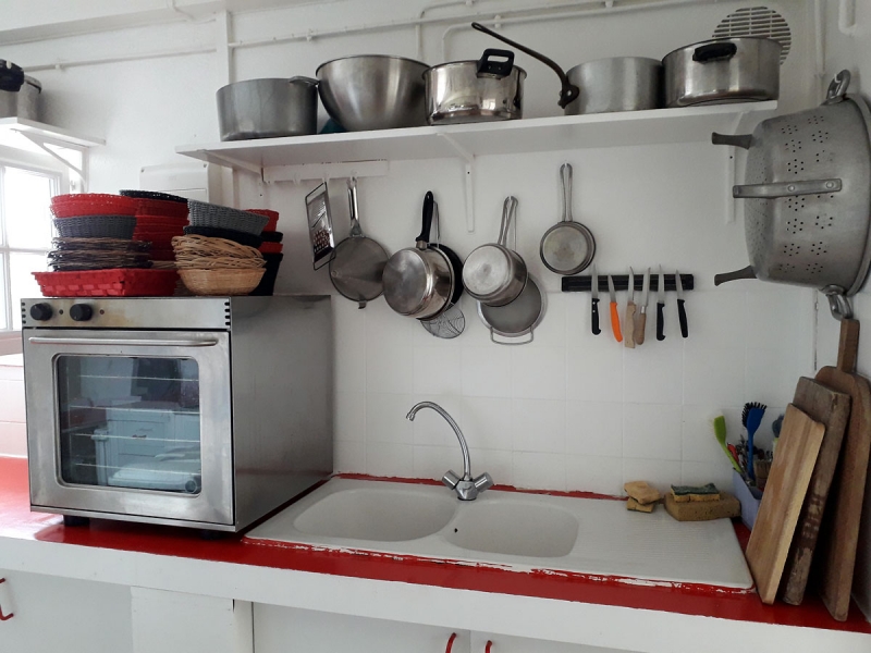 Profispülmaschine sowie einem Kühlraum. Einkäufe von lokalen Produkten (Obst, Gemüse, Fleisch etc.) können auf den