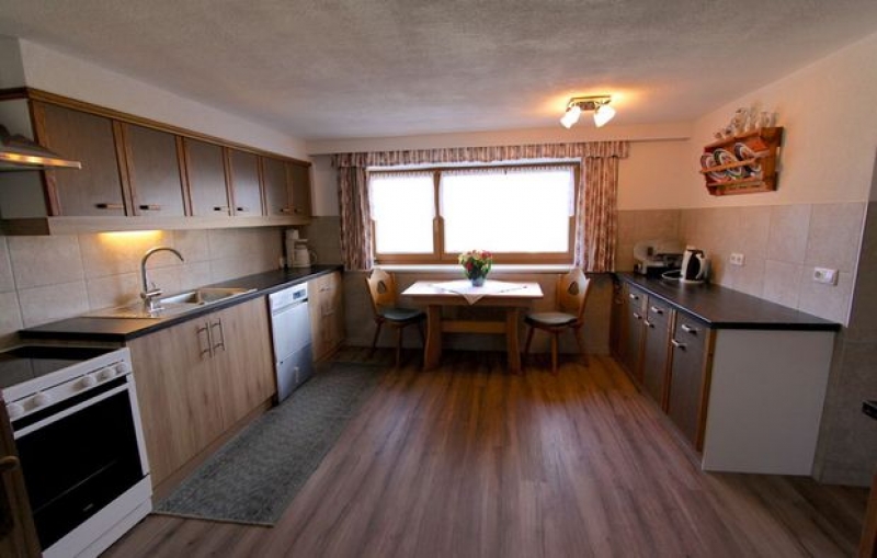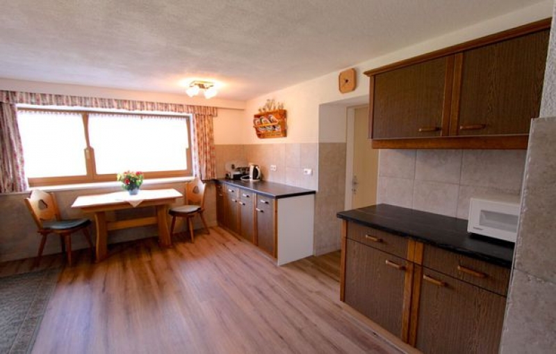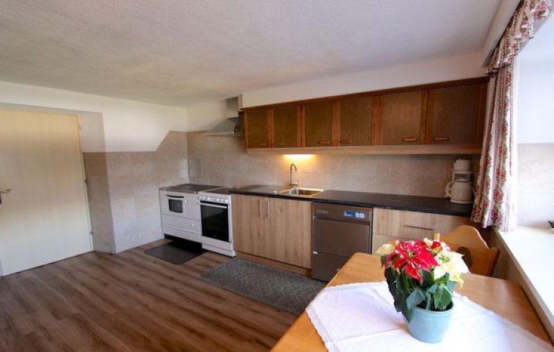Gut eingerichtete SV-Küche mit allem notwendigen Inventar, wie z.B. Holzherd, Elektroherd, Mikrowelle, Brotschneider etc.