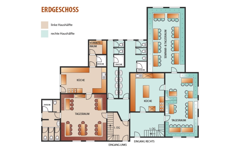 Das Gruppenhaus besteht aus zwei Haushäften, die zusammen und einzeln gemietet werden können: