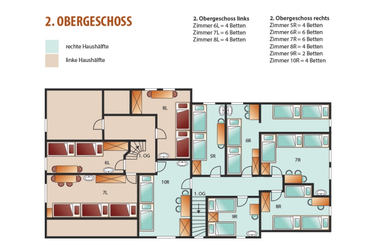 - 2. Etage: 6 Zimmer mit 26 Betten: